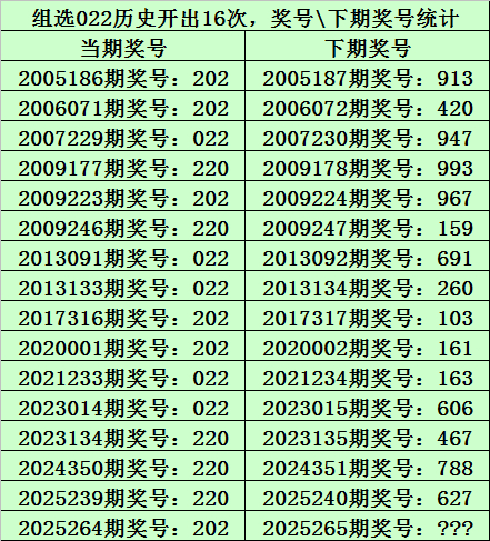 上期回顾:排列三第2025264期奖号为:202,类型:组三,历史上直选号码202出现了6次,组选号码022出现了16次。