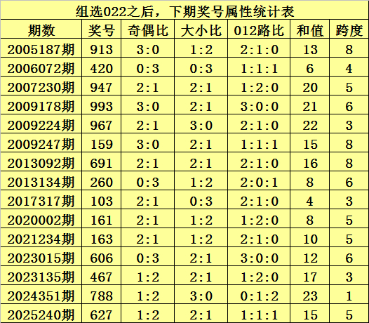二、组选022分析:排列三历史上已开出16次组选号码022了,其奖号和下期开出奖号统计如下: